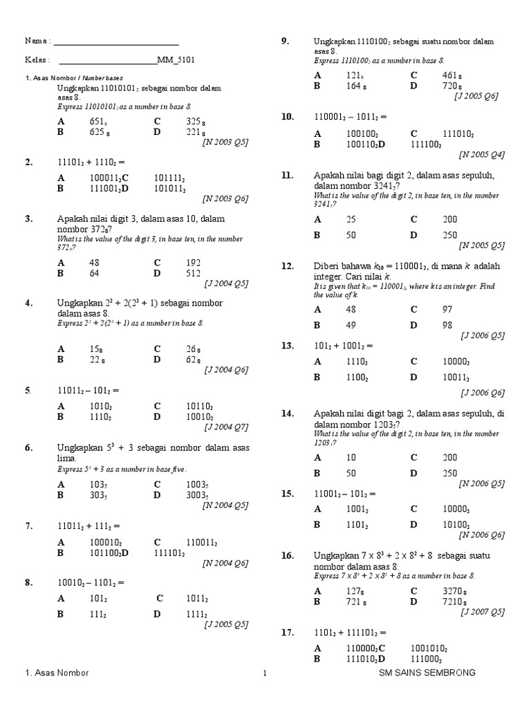 Asas Nombor Penukaran Asas Dan Operasi Worksheet